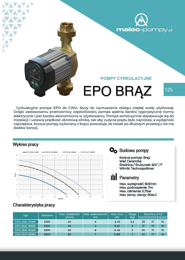 Służą do wymuszania obiegu ciepłej wody użytkowej. Dzięki zastosowaniu przetwornicy częstotliwości, pompa spełnia bardzo rygorystyczne normy elektryczne i jest bardzo ekonomiczna w użytkowaniu. Pompa samoczynnie dopasowuje się do instalacji i ustawia prędkość obrotową silnika, tak aby zużycie prądu było najniższe, a wydajność największa. Korpus pompy wykonany z brązu powoduję, że nawet po dłuższym przestoju nie ma śladów korozji.