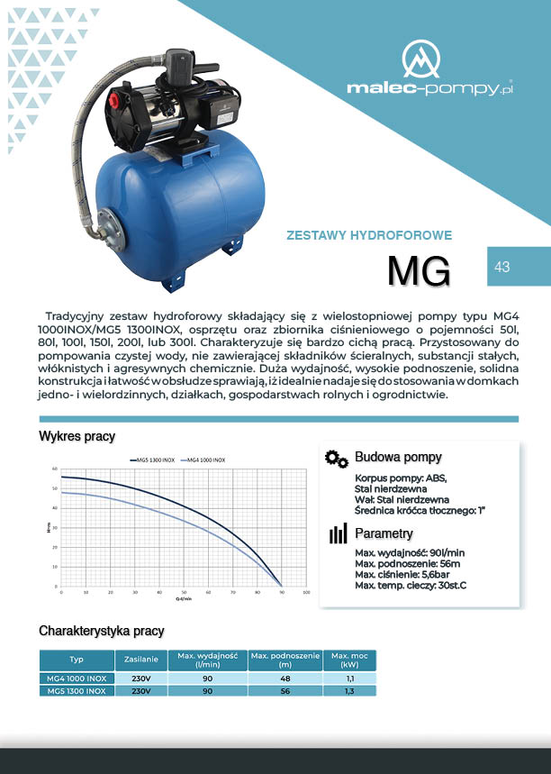 Tradycyjny zestaw hydroforowy składający się z wielostopniowej pompy typu MG4 1000INOX/MG5 1300INOX, osprzętu oraz zbiornika ciśnieniowego o pojemności 50l, 80l, 100l, 150l, 200l, lub 300l.